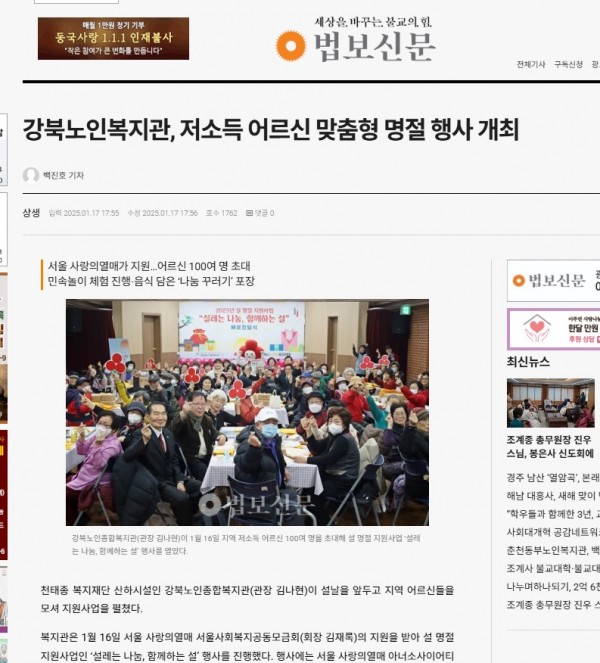 [2025.01.17] 강북노인복지관, 저소득 어르신 맞춤형 명절 행사 개최 - 법보신문