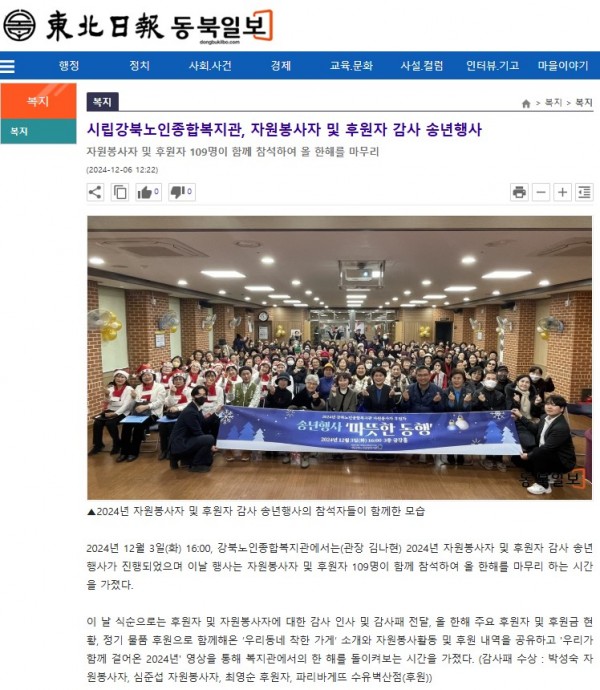 [2024.12.06] 시립강북노인종합복지관, 자원봉사자 및 후원자 감사 송년행사-동북일보