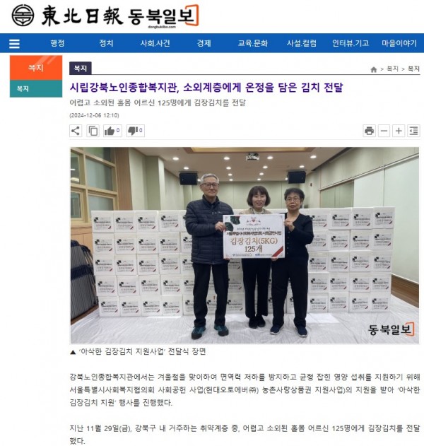 [2024.12.06] 시립강북노인종합복지관, 소외계층에게 온정을 담은 김치 전달-동북일보