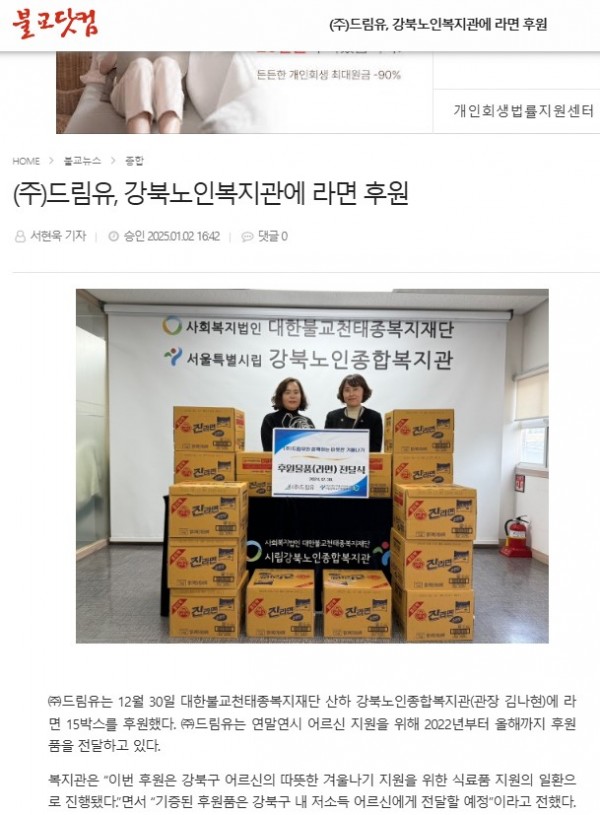 [2025.01.02](주)드림유, 강북노인복지관에 라면 후원 - 불교닷컴
