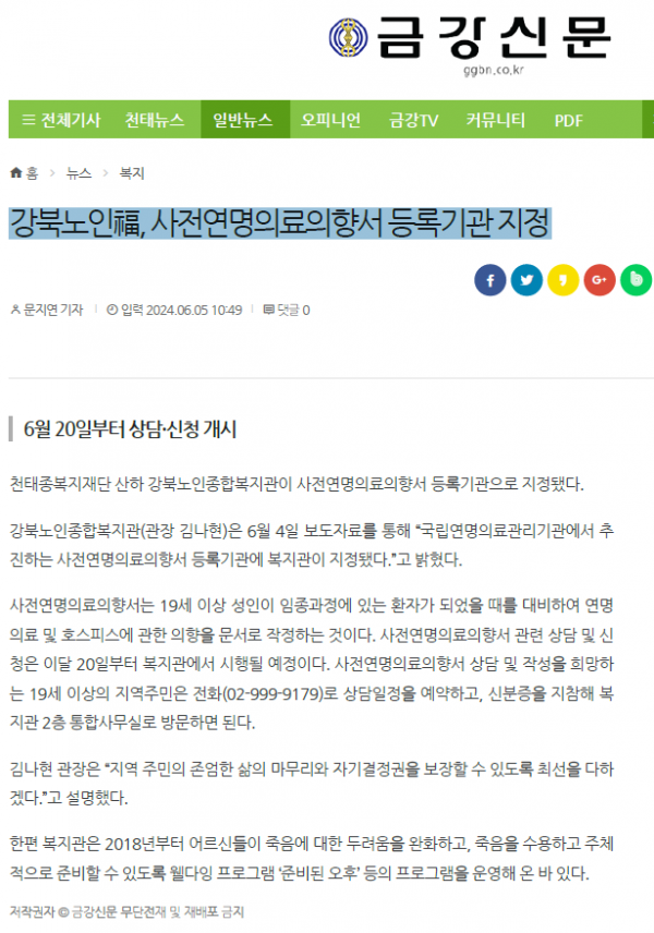 [2024.06.05]강북노인福, 사전연명의료의향서 등록기관 지정(금강신문)