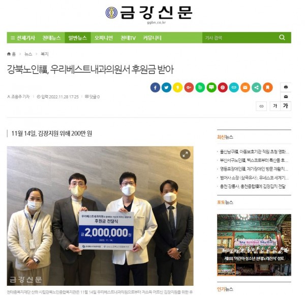 [2022.11.28] 금강신문-강북노인복, 우리베스트내과의원서 후원금 받아