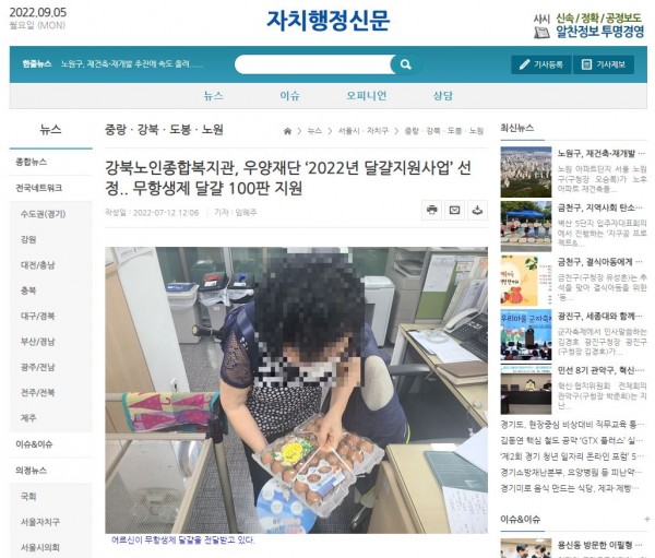 [2022.07.12] 자치행정신문-강북노인종합복지관, 우양재단 '2022년 달걀지원사업' 선정..무항생제 달걀 100판 지원