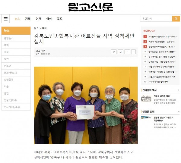 [2022.09.01] 밀교신문-강북노인종합복지관 어르신들 지역 정책제안 실시