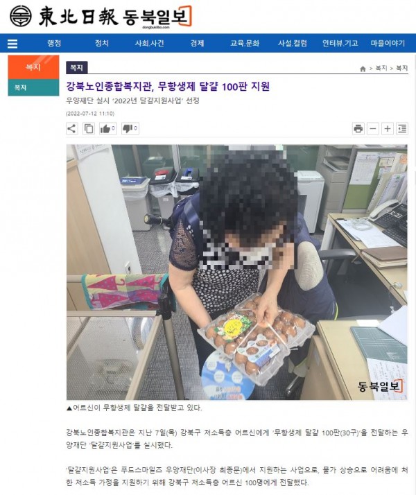 [2022.07.12] 동북일보-강북노인종합복지관, 무항생제 달걀 100판 지원