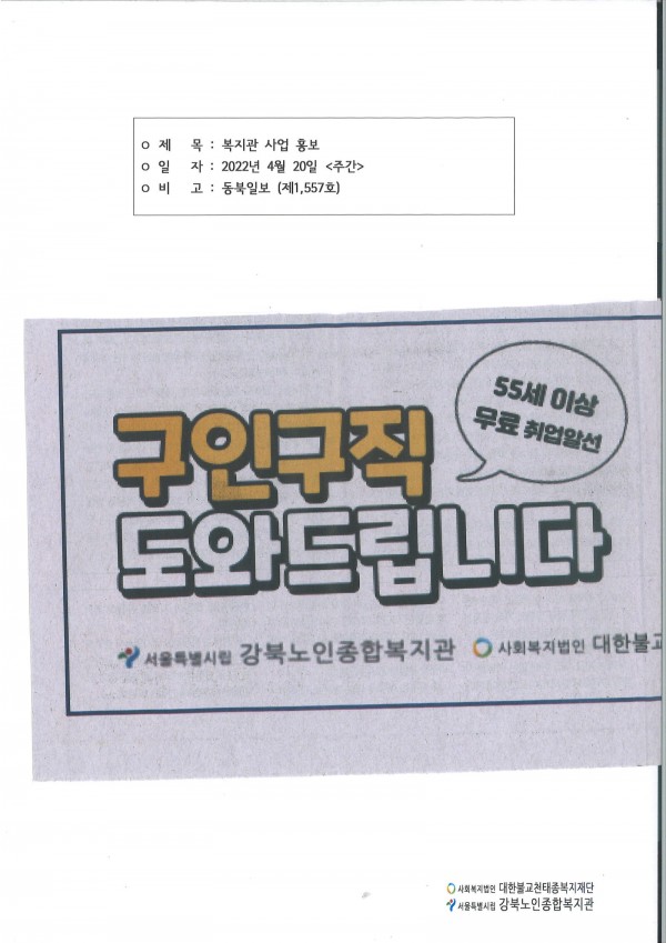 [2022.04.20] 오프라인 동북일보 - 복지관 고령자취업알선사업 홍보