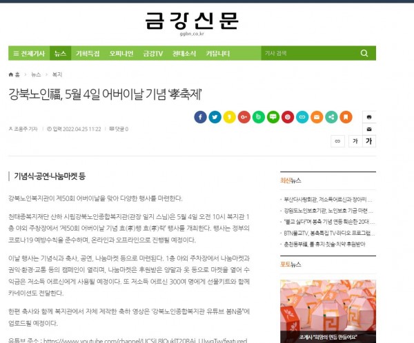 [2022.04.25] 금강신문 - 강북노인복,5월4일 어버이날 기념'효축제'