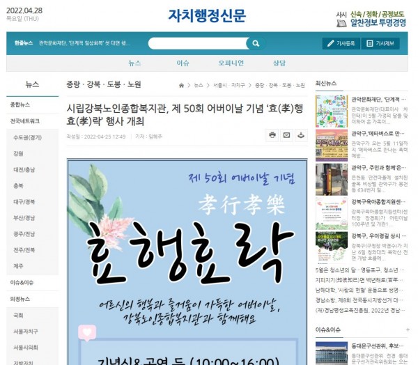 [2022.04.25] 자치행정신문-시립강북노인종합복지관,제50회 어버이날 기념'효행효락'행사 개최