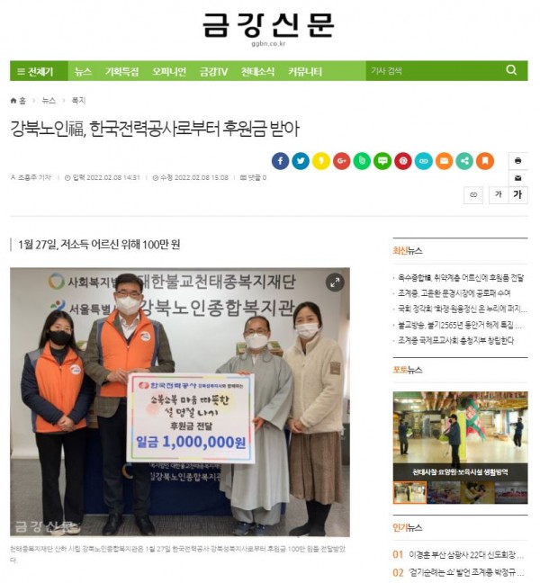 [2022.02.08] 금강신문-강북노인복, 한국전력공사로부터 후원금 받아