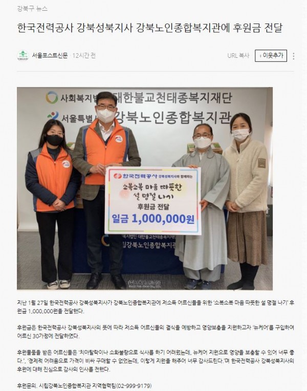[2022.02.09] 서울포스트신문-한국전력공사 강북성북지사 강북노인종합복지관에 후원금 전달
