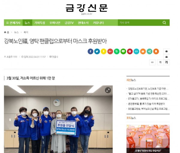 [2022.04.01] 금강신문 - 강북노인福, 영탁 팬클럽으로부터 마스크 후원받아