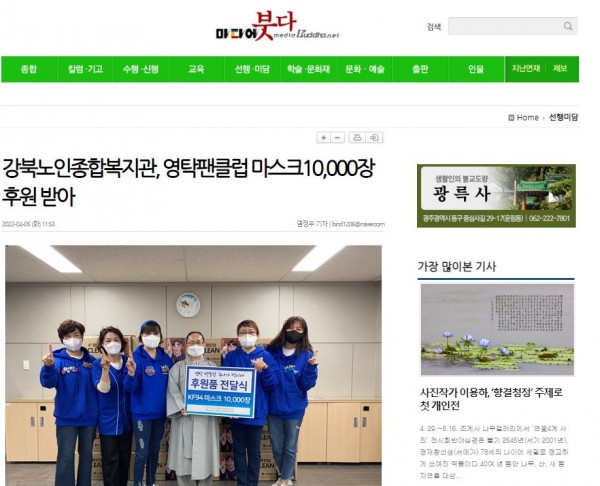 [2022.04.05] 미디어붓다-강북노인종합복지관,영탁팬클럽 마스크10,000장 후원 받아