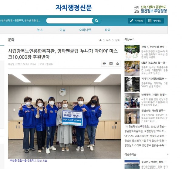[2022.04.01] 자치행정신문 - 시립강북노인종합복지관, 영탁팬클럽 '누나가 딱이야' 마스크10,000장 후원받아