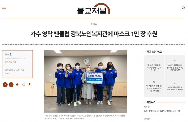 [2022.04.04] 불교저널 - 가수 영탁 팬클럽 강북노인복지관에 마스크 1만장 후원