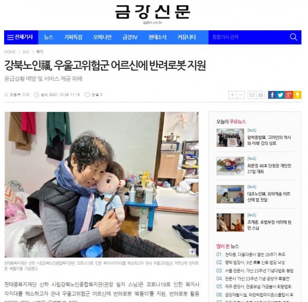 [2021.10.26] 금강신문-강북노인복,우울고위험군 어르신에 반려로봇 지원