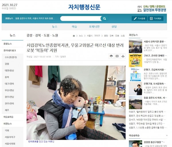 [2021.10.25] 자치행정신문-시립강북노인종합복지관, 우울고위험군 어르신 대상 반려로봇 '복돌이' 지원