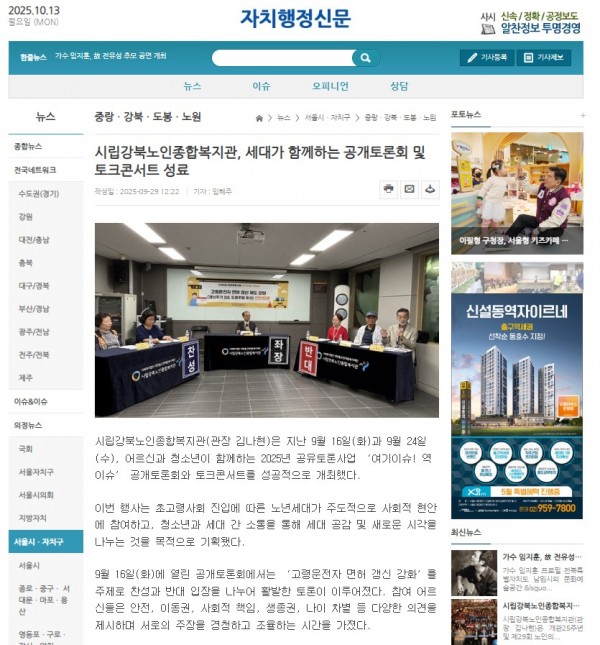 [2025.09.29] 시립강북노인종합복지관, 세대가 함께하는 공개토론회 및 토크콘서트 성료 - 자치행정신문