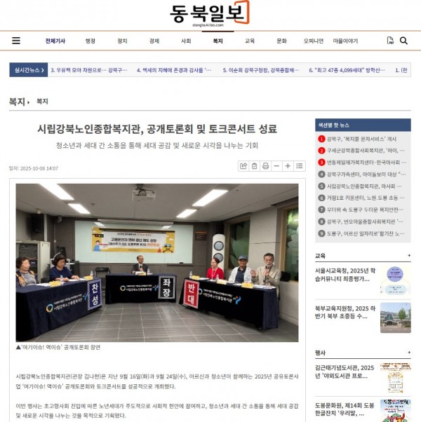 [2025.10.08] 시립강북노인종합복지관, 공개토론회 및 토크콘서트 성료 - 동북일보