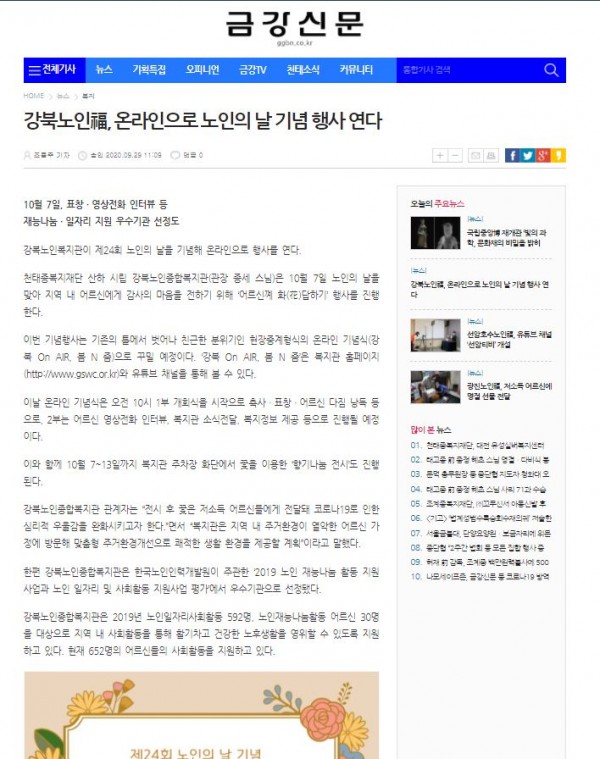 [2020.09.29]금강신문-강북노인福,온라인으로 노인의 날 기념 행사 연다