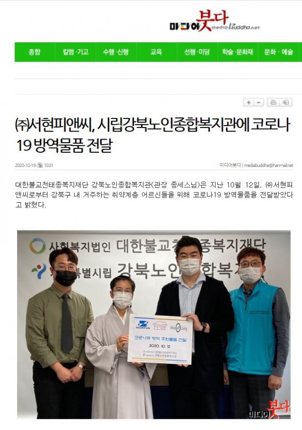 [2020.10.19]미디어붓다-(주)서현피앤씨,시립강북노인종합복지관에 코로나19 방역물품 전달