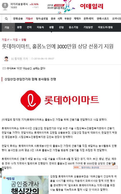 [2018.06.15] 이데일리 - 롯데하이마트, 홀몸노인에 3000만원 상당 선풍기 지원