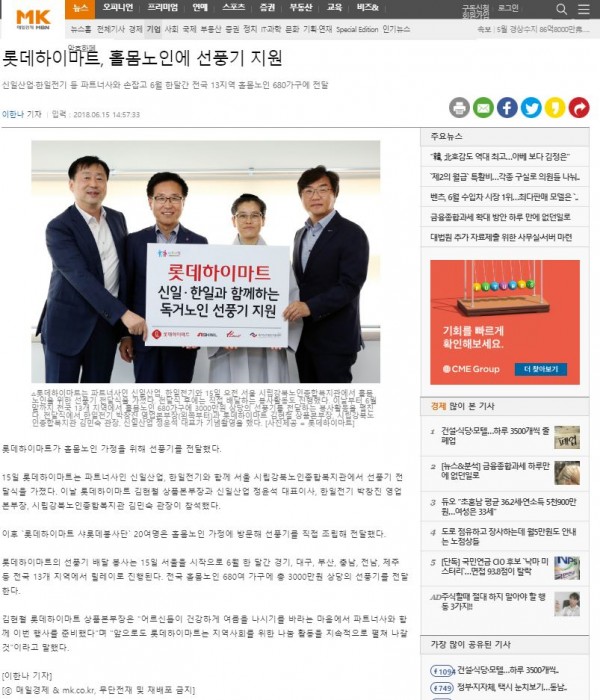 [2018.06.15] 매일경제 - 롯데하이마트, 홀몸노인에 선풍기 지원