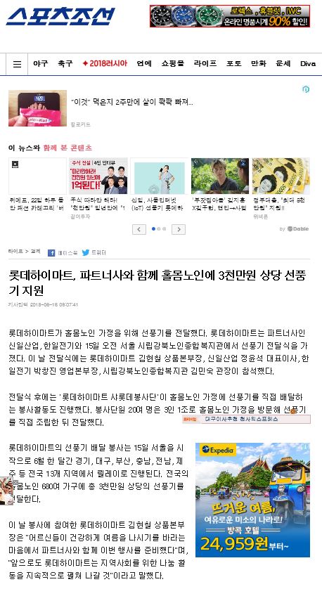 [2018.06.16] 스포츠조선 - 롯데하이마트, 파트너사와 함께 홀몸노인에 3천만원 상당 선풍기 지원