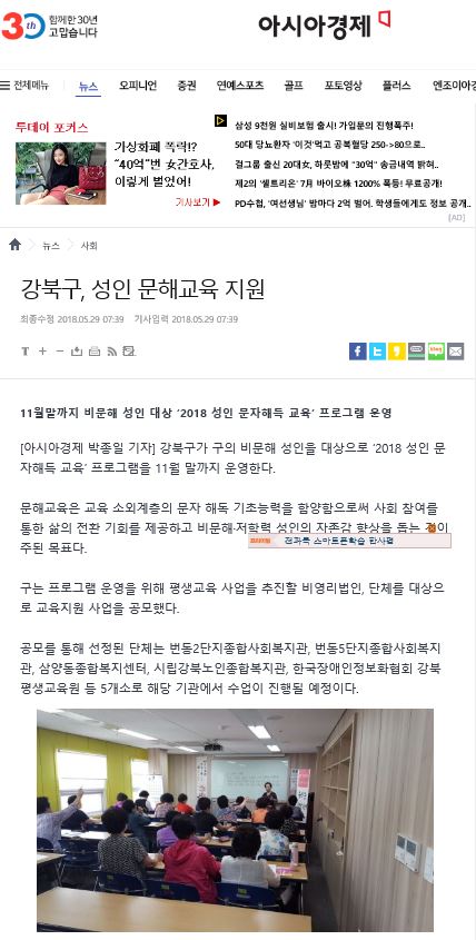 [2018.05.29] 아시아경제 - 강북구, 성인 문해교육 지원