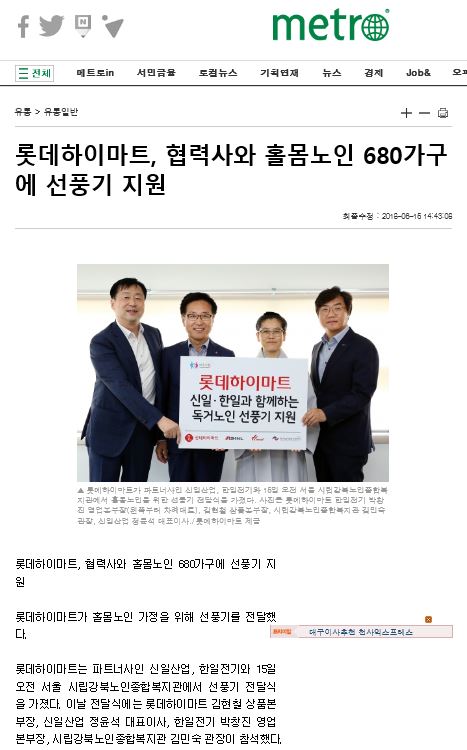[2018.06.15] 메트로신문 - 롯데하이마트, 협력사와 홀몸노인 680가구에 선풍기 지원