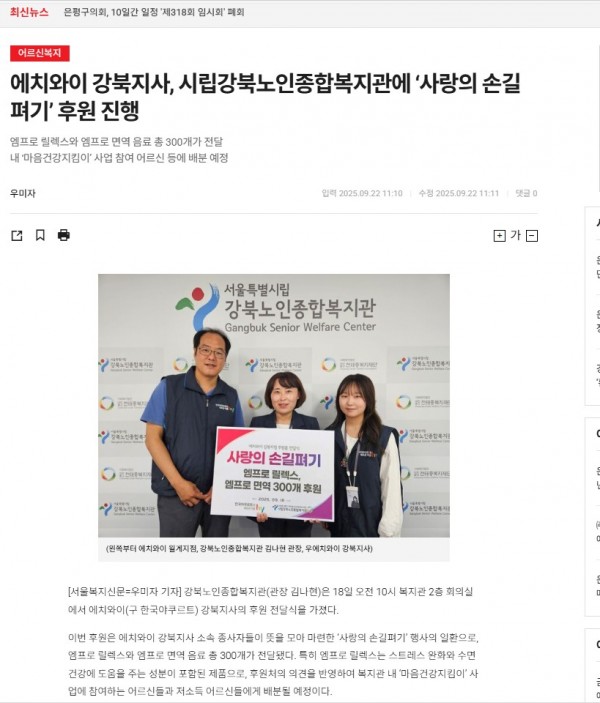 [2025.09.22] 에치와이 강북지사, 시립강북노인종합복지관에 ‘사랑의 손길펴기’ 후원 진행 _ 어르신복지 _ 기사본문 -…