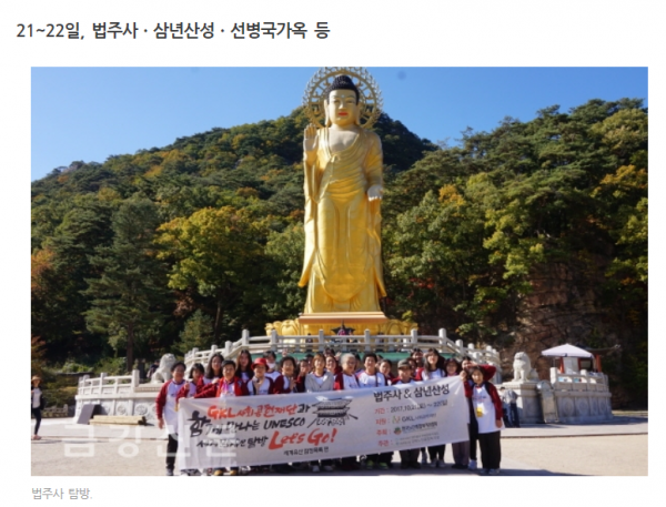 천태종복지재단 산하 서울시립 강북노인종합복지관(관장 종세 스님)은 10월 21~22일 충북 보은군 일대에서 복지관 어르신 15명과 지역 청소년 15명 등 30명을 대상으로 ‘유네스코 세계문화유산 탐방, Let's Go - 세계유산 잠정목록 편’을 실시했다.