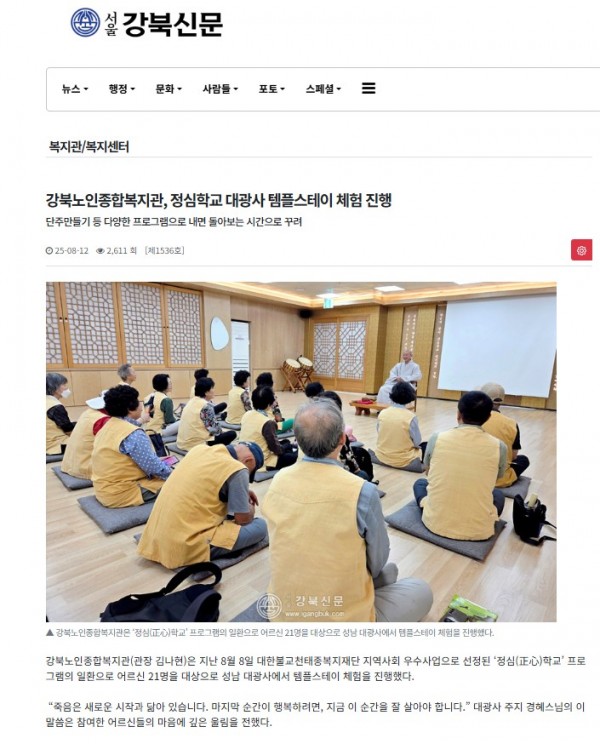 [2025.08.12] 강북노인종합복지관, 정심학교 대광사 템플스테이 체험 진행 - 서울강북신문