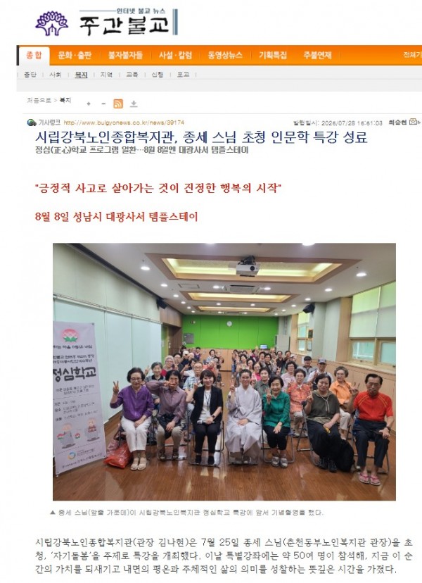[2025.07.28] 시립강북노인종합복지관, 종세 스님 초청 인문학 특강 성료 - 주간불교