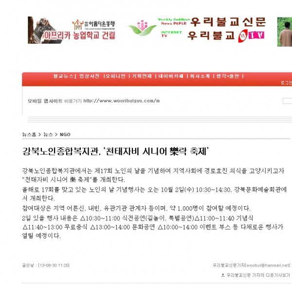 [2013.8.30] 우리불교신문 - 강북노인종합복지관 "천태자비 시니어 樂 축제"