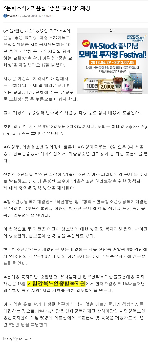 [2013.6.17] 연합뉴스 - 문화소식 기윤실 "좋은 교회상 제정