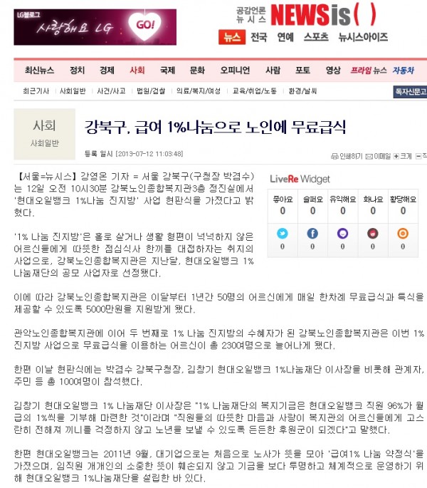 [2013.7.12] 뉴시스 - 강북구, 급여 1%나눔으로 노인에게 무료급식