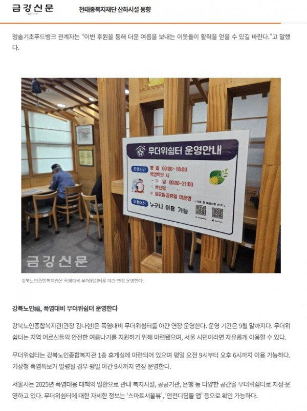 [2025.07.18] 천태종복지재단 산하시설 동향 '강북노인福, 폭염대비 무더위쉼터 운영한다' - 금강신문
