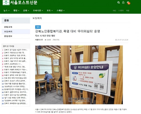 [2025.07.24]강북노인종합복지관, 폭염 대비 ‘무더위쉼터’ 운영 - 서울포스트신문