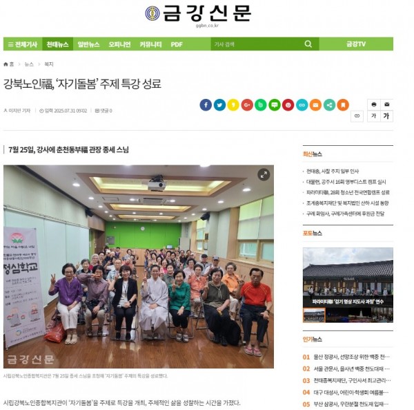 [2025.07.30] 정심(正心)학교 종세 스님 초청 인문학 특강 성료 - 금강신문