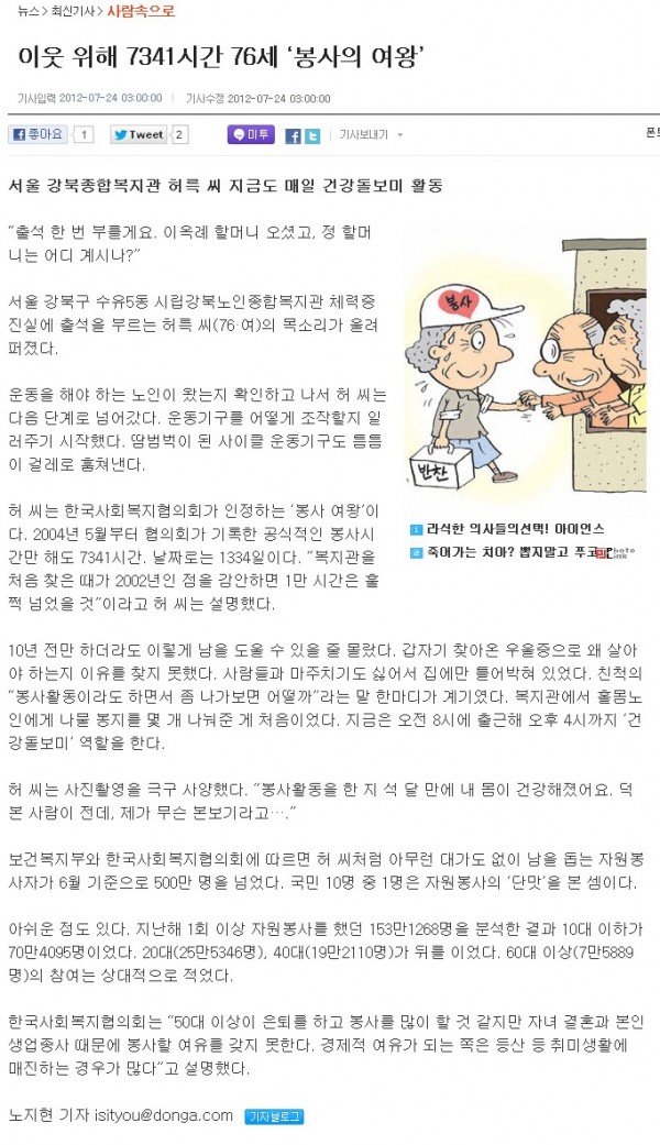 [2012.7.24]동아닷컴 - 이웃위해 7341시간 76세 봉사의 여왕