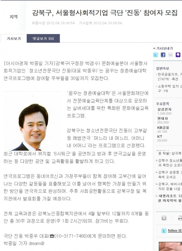 [2012.4.19]아시아경제 - 강북구, 서울형사회적기업 극단 '진동' 참여자 모집