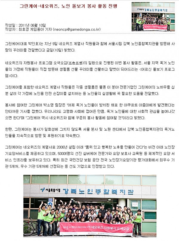 [2011.6.10] 게임동아 - 그린케어, 네오위즈 노인 돌보기 봉사 활동 진행
