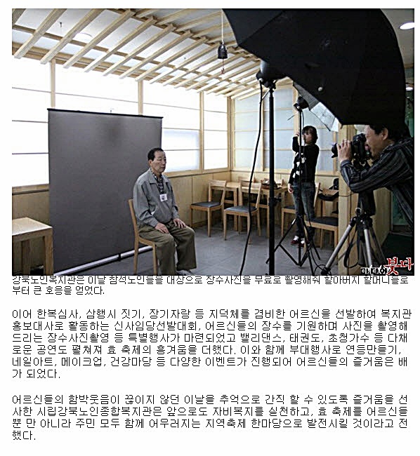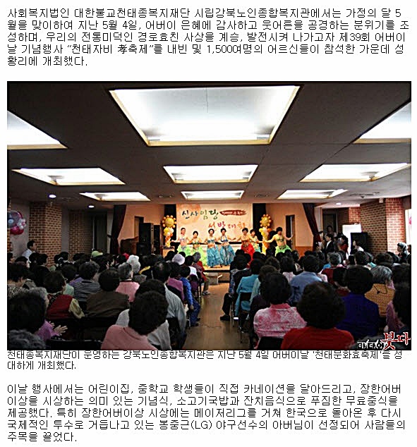 <DIV>시립강북노인종합복지관에서는&nbsp;지난 5월 4일&nbsp;어버이날행사 '천태자비 효 축제'가 진행되었으며, 이에 대한&nbsp;자료가 보도되었습니다.&nbsp;</DIV></BODY></HTML>