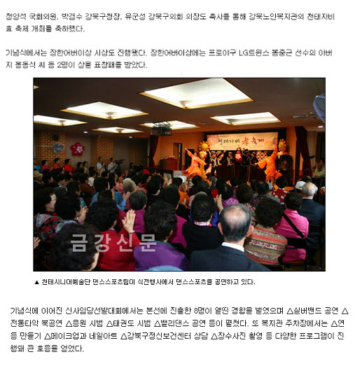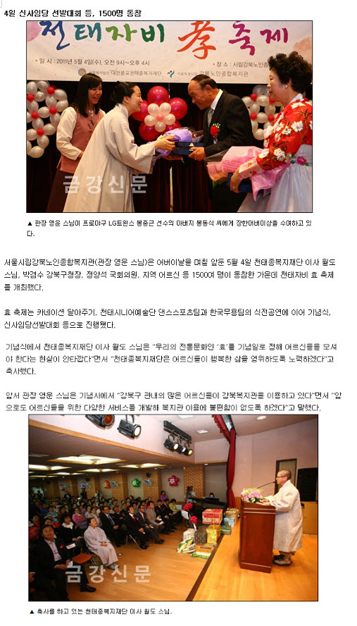 <DIV>시립강북노인종합복지관에서는 지난 5월 4일 어버이날행사 '천태자비 효 축제'가 진행되었으며, 이에 대한 자료가 보도되었습니다. </DIV></BODY></HTML>