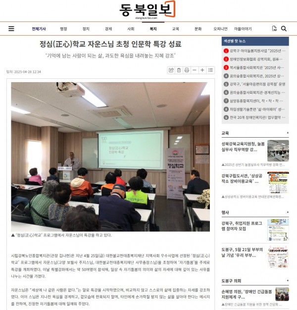 [2025.04.28] 정심(正心)학교 자운스님 초청 인문학 특강 성료 - 동북일보
