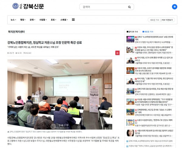 [2025.04.30] 강북노인종합복지관, 정심학교 자운스님 초청 인문학 특강 성료 - 서울강북신문