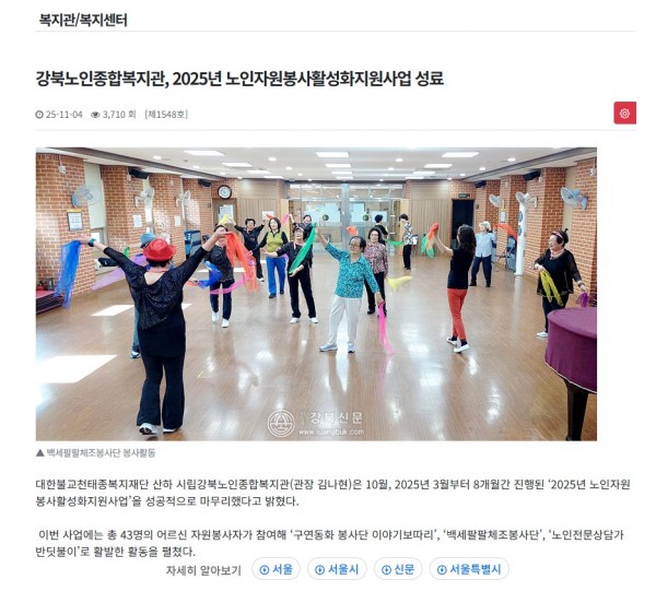 [2025.11.04] 강북노인종합복지관, 2025년 노인자원봉사활성화지원사업 성료 - 서울강북신문
