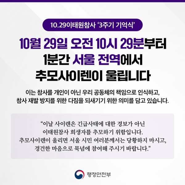 10월 29일 오전 10시 29분부터 1분간 서울 전역에서 추모사이렌이 울립니다.
