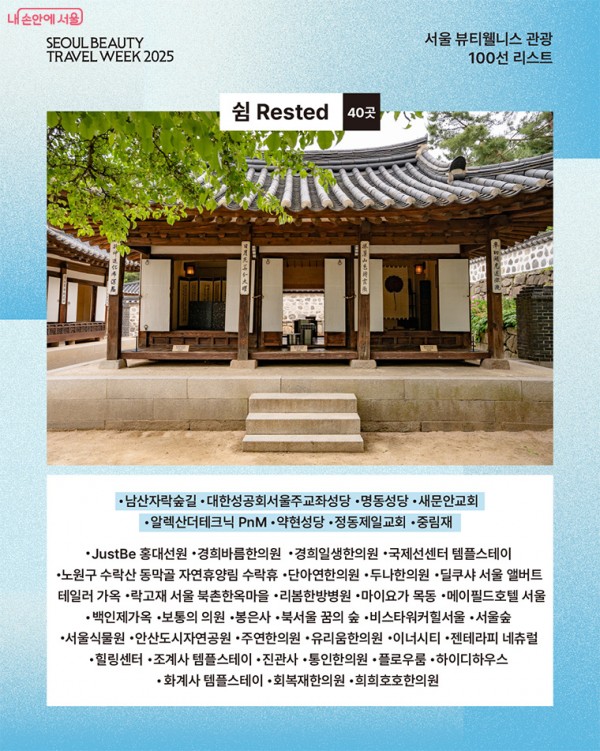 이번 100선은 서울 속 쉼, 맛, 멋 문화를 아우르는 구성으로 ▴쉼(힐링명상, 자연치유, 의료한방, 스테이) 40곳, ▴맛(푸드) 18곳, ▴멋(뷰티스파, 문화예술) 42곳으로 구성됐다.
