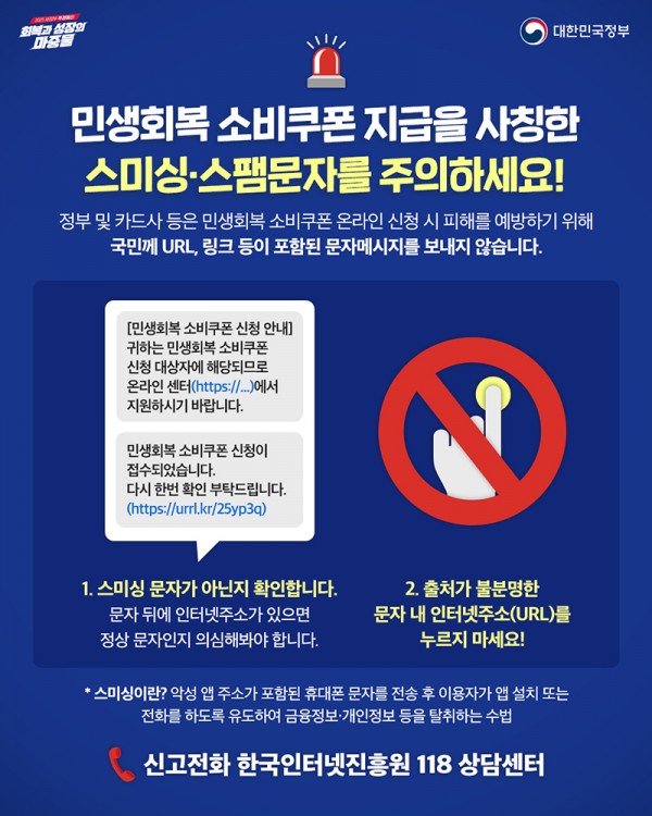 정부 및 카드사 등은 민생회복 소비쿠폰 온라인 신청 시 피해를 예방하기 위해 국민께 URL, 링크 등이 포함된 문자메시지를 보내지 않습니다.